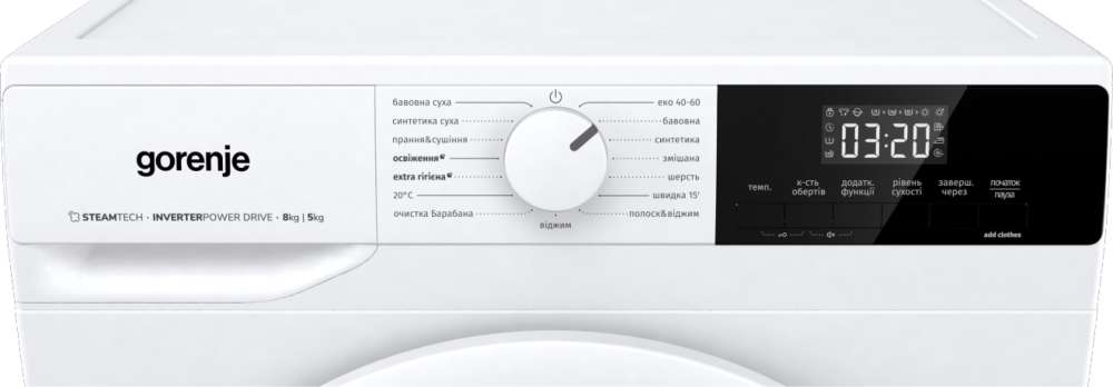 | Основні програми | Швидке прання, Гігієнічна, Освіжити (Refresh), Віджимання, Очищення барабана, Полоскання + віджим, Прання в холодній воді, Прання+сушка, Економічне прання ECO |